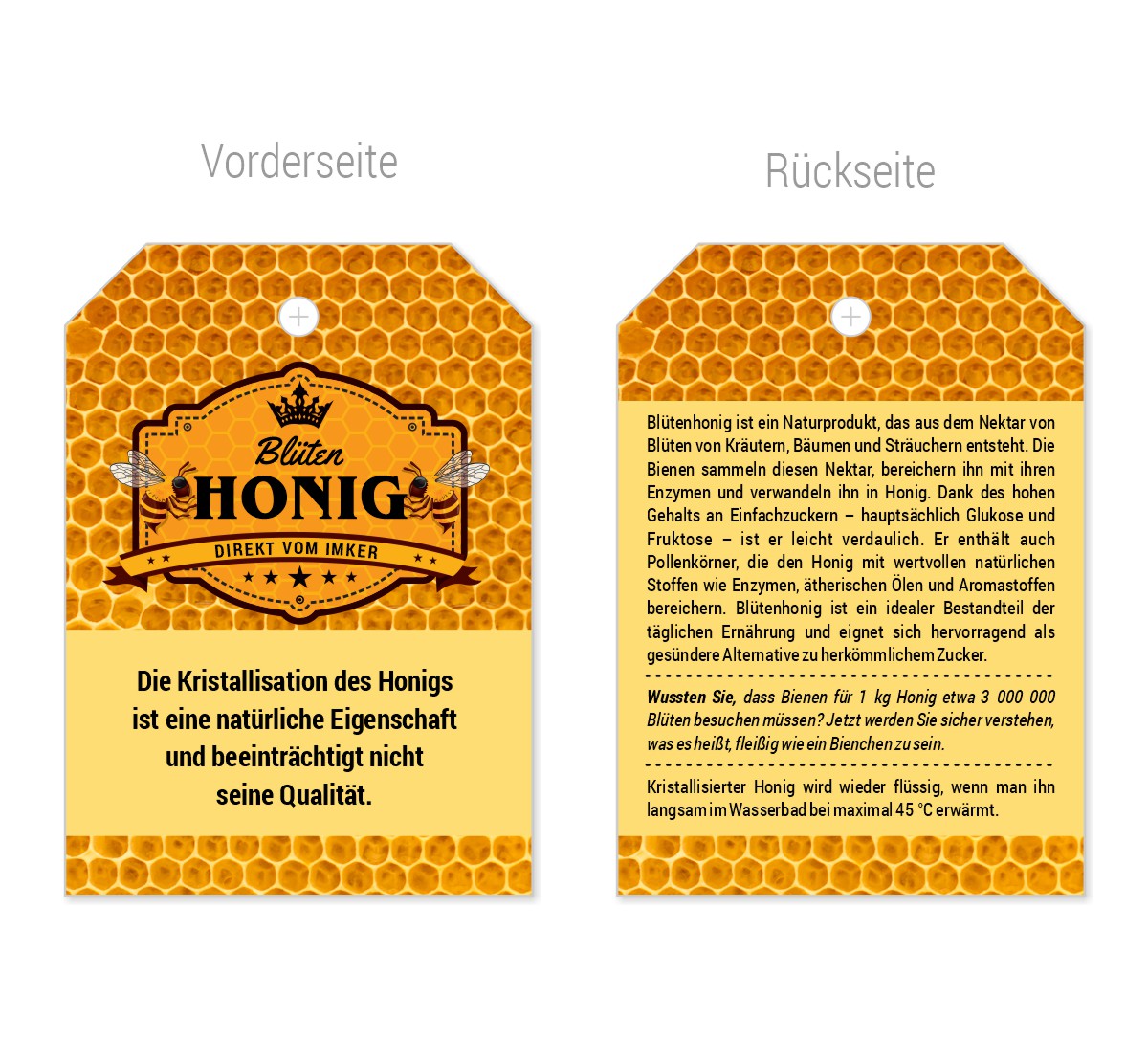 Etiketten im Format einer beidseitigen Karte mit den Maßen 48 × 67 mm und einem Loch zum Aufhängen oder Befestigen sind für alle Arten von Honiggläsern oder auch für Metflaschen geeignet, an denen sich die Etikette anbringen lässt. Die Etiketten werden ohne weitere Anpassungen genau so geliefert, wie Sie sie sehen. Sie sind auf 300g Bilderdruckpapier gedruckt und verfügen über ein vorgestanztes Loch zur Befestigung.