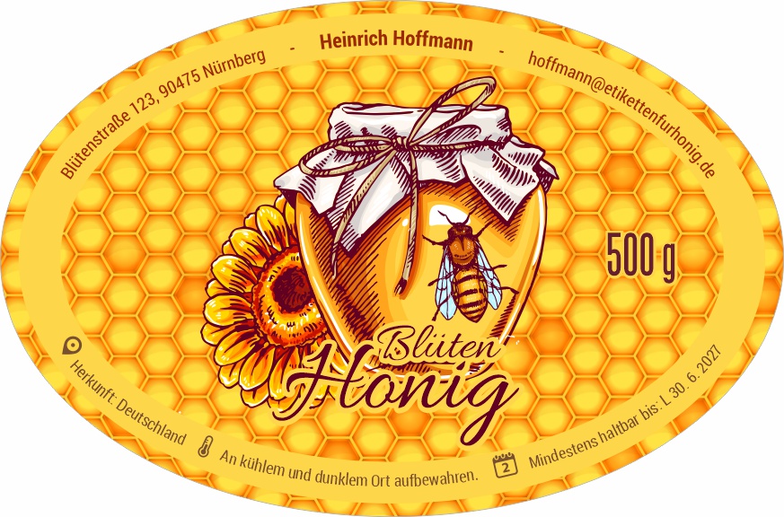 Selbstklebende Etikette für Honig, oval  in der Abmessung 90x61 mm, geeignet für Gläser größeren und kleineren Volumens, auf denen das Etikett dieser Abmessung gewiss Platz findet.