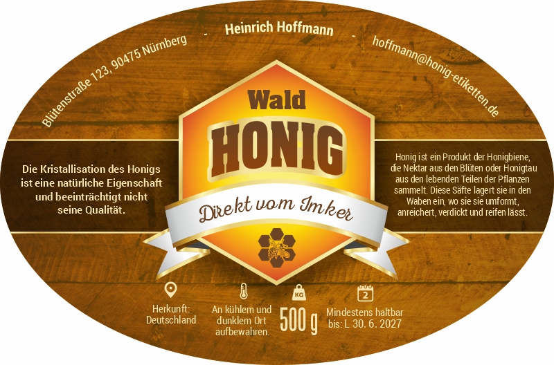 Selbstklebende Etikette für Honig, oval  in der Abmessung 90x61 mm, geeignet für Gläser größeren und kleineren Volumens, auf denen das Etikett dieser Abmessung gewiss Platz findet.