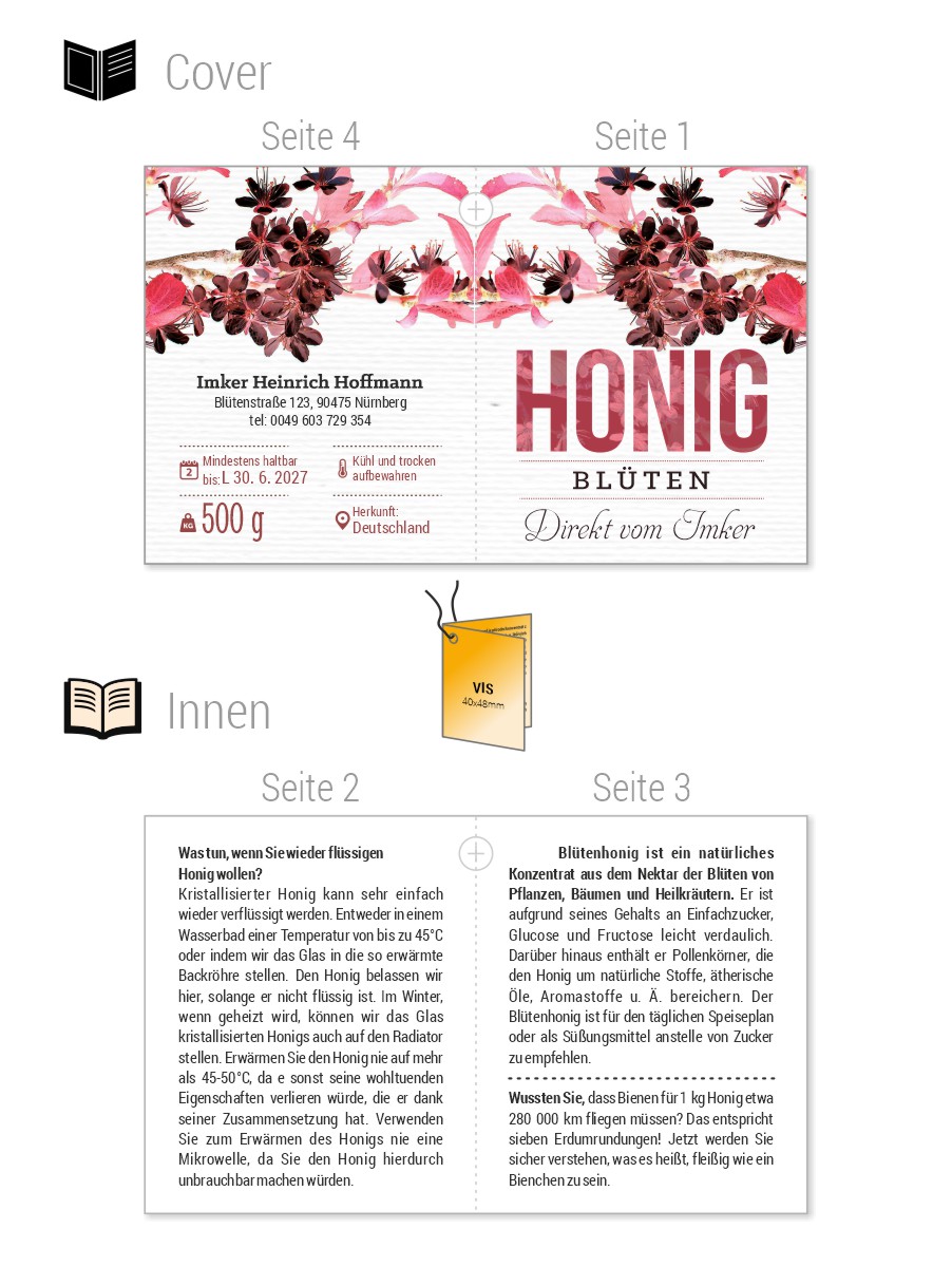 Die Faltkärtchen des Formats Büchlein 40 x 48 mm (in gefaltetem Zustand) mit einer Öffnung für das Aufhängen/Anbinden am Honigglas sind für sämtliche Gläser geeignet, wo Raum für das Anbinden eines solchen Kärtchens vorhanden ist. Die Anhänger des Formats der beidseitigen Karte 48 x 67 mm mit einer Öffnung für das Aufhängen/Anbinden am Honigglas sind für sämtliche Gläser geeignet, wo Raum für das Anbinden eines solchen Kärtchens vorhanden ist. Sie sind auf 300g Bilderdruckpapier gedruckt und verfügen über ein vorgestanztes Loch zur Befestigung.