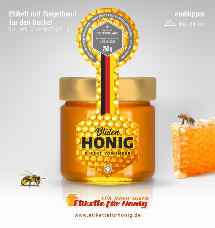 Startseite > Honigetiketten 58x153mm und 45x124mm, mit Siegelband > Honigetiketten 45x124mm, mit Siegelband (250g)