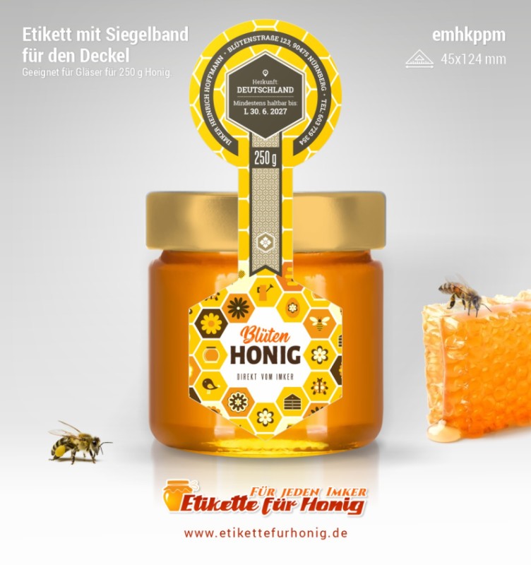 Startseite > Honigetiketten 58x153mm und 45x124mm, mit Siegelband > Honigetiketten 45x124mm, mit Siegelband (250g)