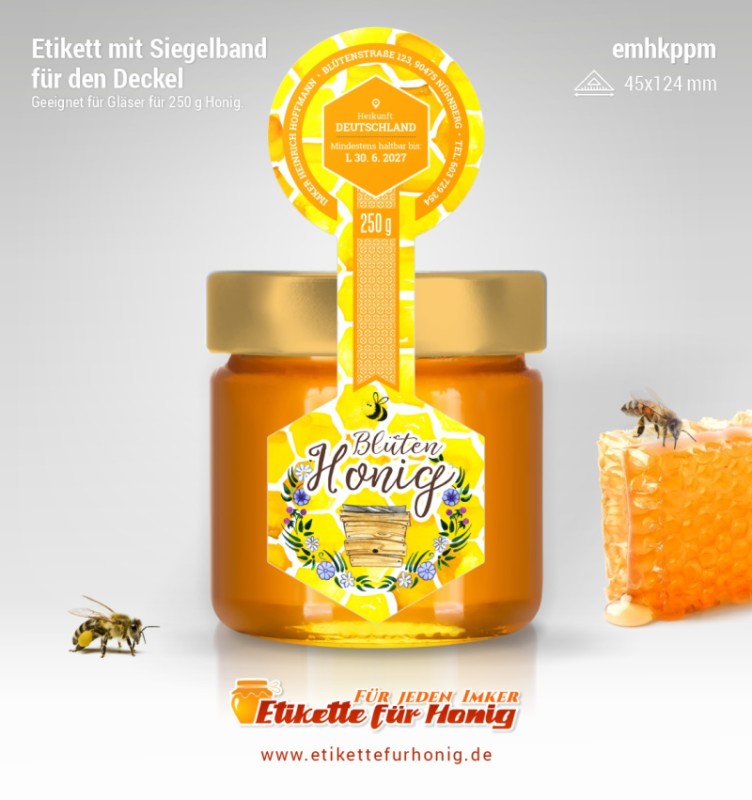 Startseite > Honigetiketten 58x153mm und 45x124mm, mit Siegelband > Honigetiketten 45x124mm, mit Siegelband (250g)