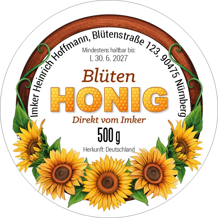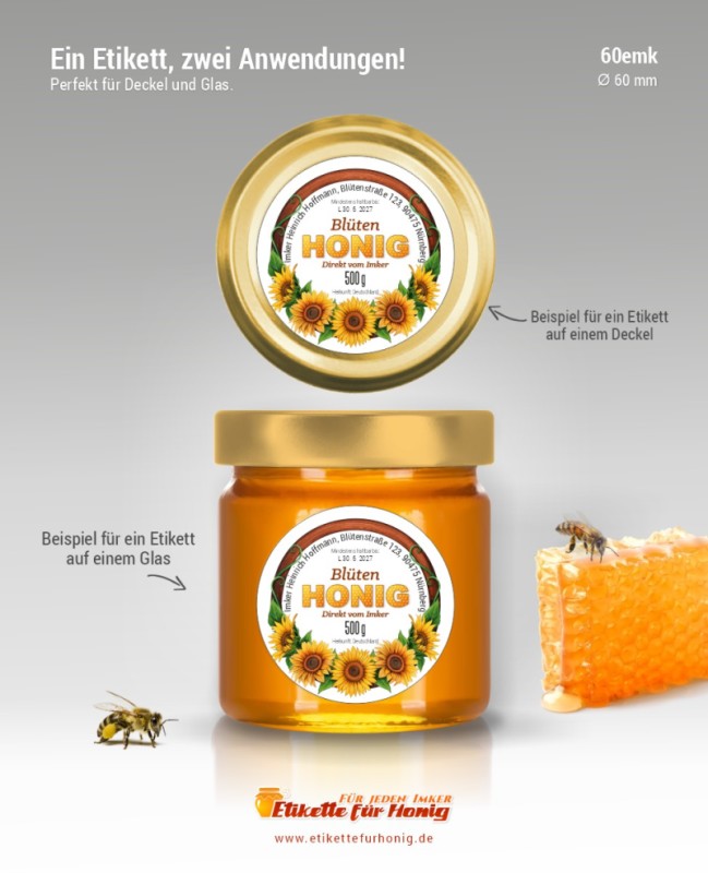 Runde Etikette für Honig, geeignet sowohl für Gläser aller Größen, als auch für alle Deckel, für die der Etikettdurchmesser von 60 mm passt.